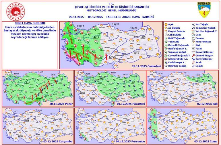 Meteoroloji Genel Müdürlüğü tarafından yapılan tahminlere göre: Yurdun batı kesimlerinin parçalı ve çok bulutlu, Marmara, Ege, Akdeniz, İç Anadolu (Sivas hariç) ile Batı Karadeniz bölgelerinin sağanak ve gök gürültülü sağanak yağışlı, diğer yerlerin az bulutlu geçeceği tahmin ediliyor. Yağışların, Marmara’nın batısı, Ege (Kutahya hariç), Batı Akdeniz ile Mersin çevrelerinde kuvvetli, Ege’nin güney kıyıları ile Edremit Körfezi çevrelerinde yer yer çok kuvvetli olması bekleniyor. İç ve doğu kesimlerde sabah ve gece saatlerinde pus ve yer yer sis hadisesi görüleceği tahmin ediliyor.