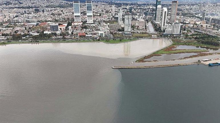 İzmir Körfezi’nin bazı bölümleri kahverengiye büründü. Derelerden denize akan çamurlu suyun neden olduğu renk değişimi dron ile görüntülendi.