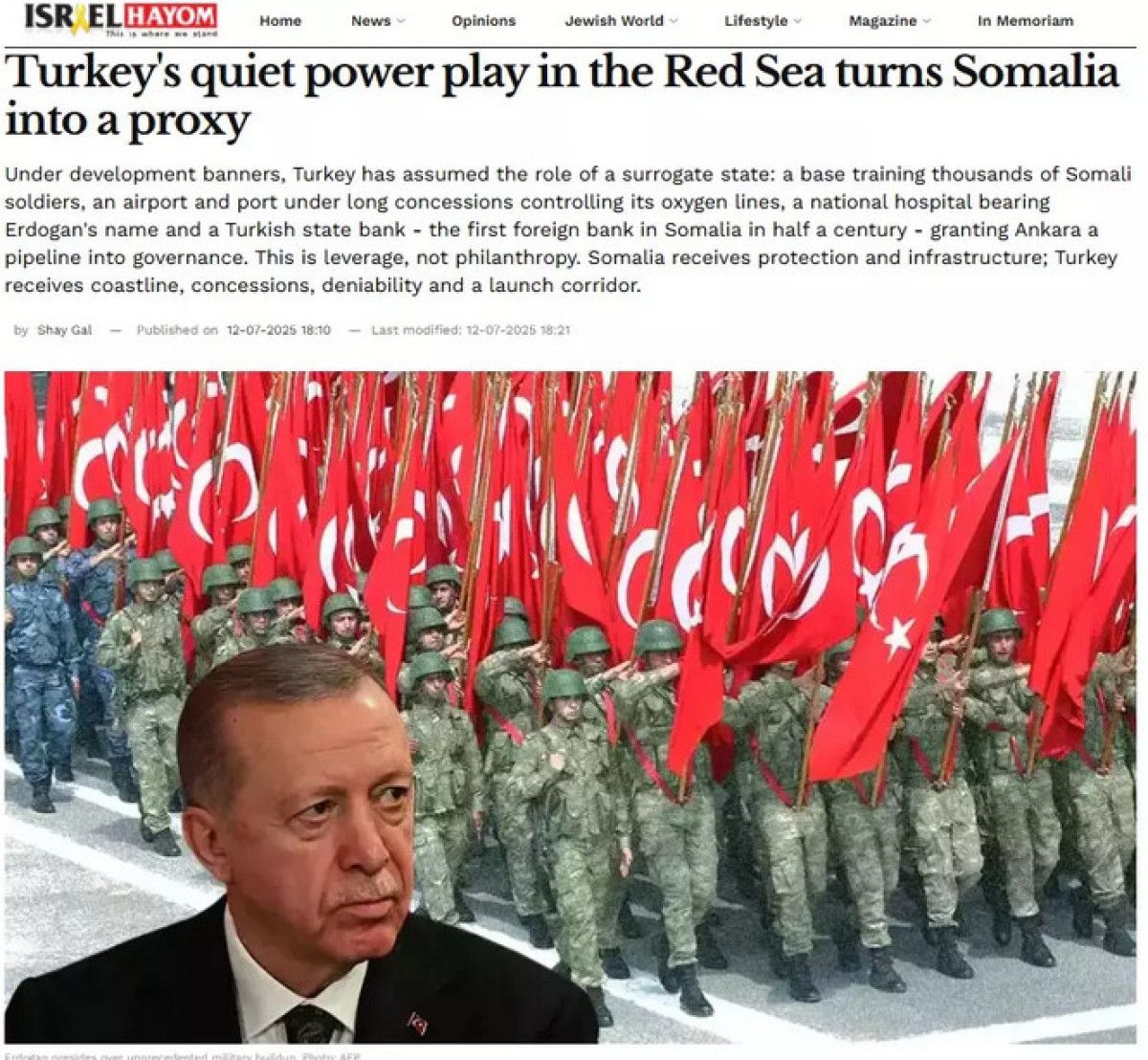 İsrail Başbakanı Binyamin Netanyahu’ya yakınlığıyla bilinen Israel Hayom’da yayımlanan bir analizde, Türkiye’nin Kızıldeniz’de yürüttüğü etkili hamlelerle Somali’yi bir “vekil devlet” konumuna taşıdığı belirtildi.
