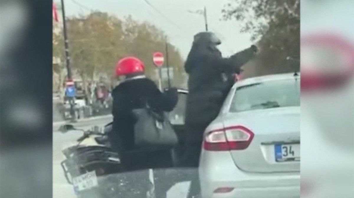 Tartışma sırasında motosiklet sürücüsü yan tarafında bulunan otomobilin kapısına birkaç kez tekme attı.
