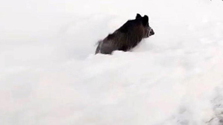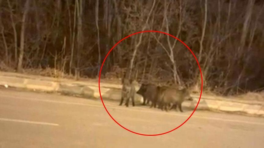 Özellikle kış şartlarında yiyecek bulamayan domuzlar, şehir merkezine yakın bölgelere kadar inmek zorunda kalıyor. İlçenin Onbaşılar mevkiinde bulunan Meşkan Tepesi’nin yolunda seyir halinde olan Muğdat Şen isimli vatandaş, aniden önüne çıkan domuz sürüsüyle karşılaştı. Karlar içinde panikle kaçan domuzlar, kameraya yansıdı.