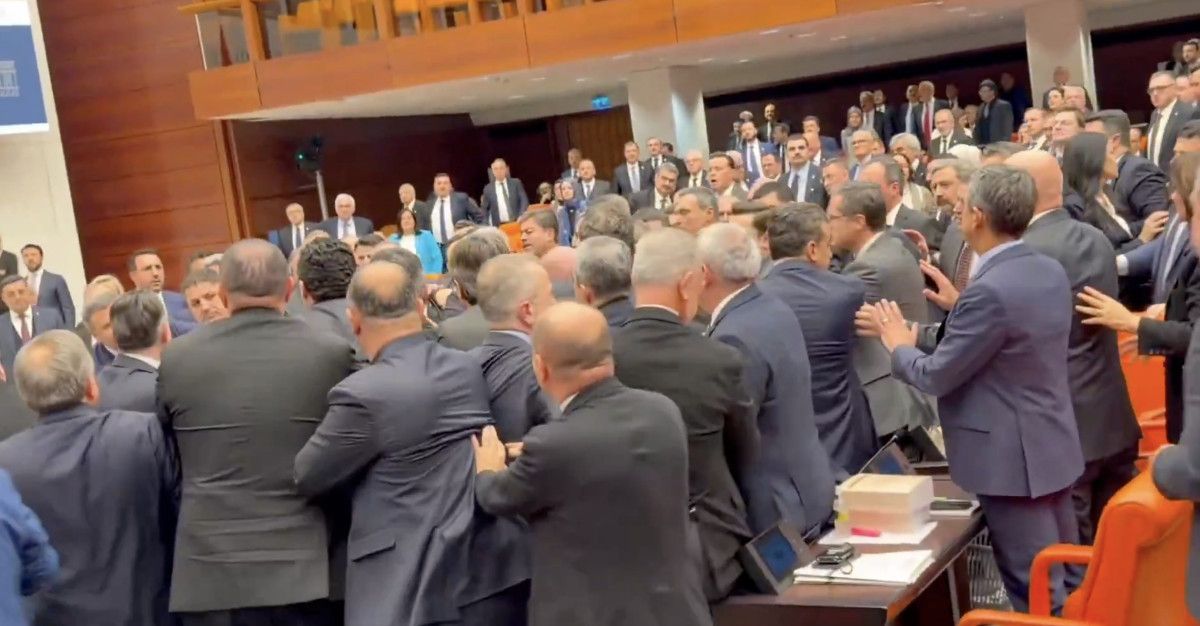 İki partinin sıralarından çok sayıda milletvekili kavgaya dahil oldu, salonun ortasında büyük bir arbede yaşandı.