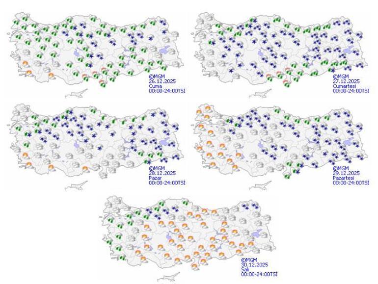 Bazı il merkezlerimizde; bugün ilâ 02 Ocak 2026 tarihleri arasında en düşük hava sıcaklıklarının aşağıda belirtilen değerlere (°C) kadar düşeceği tahmin edilmektedir.