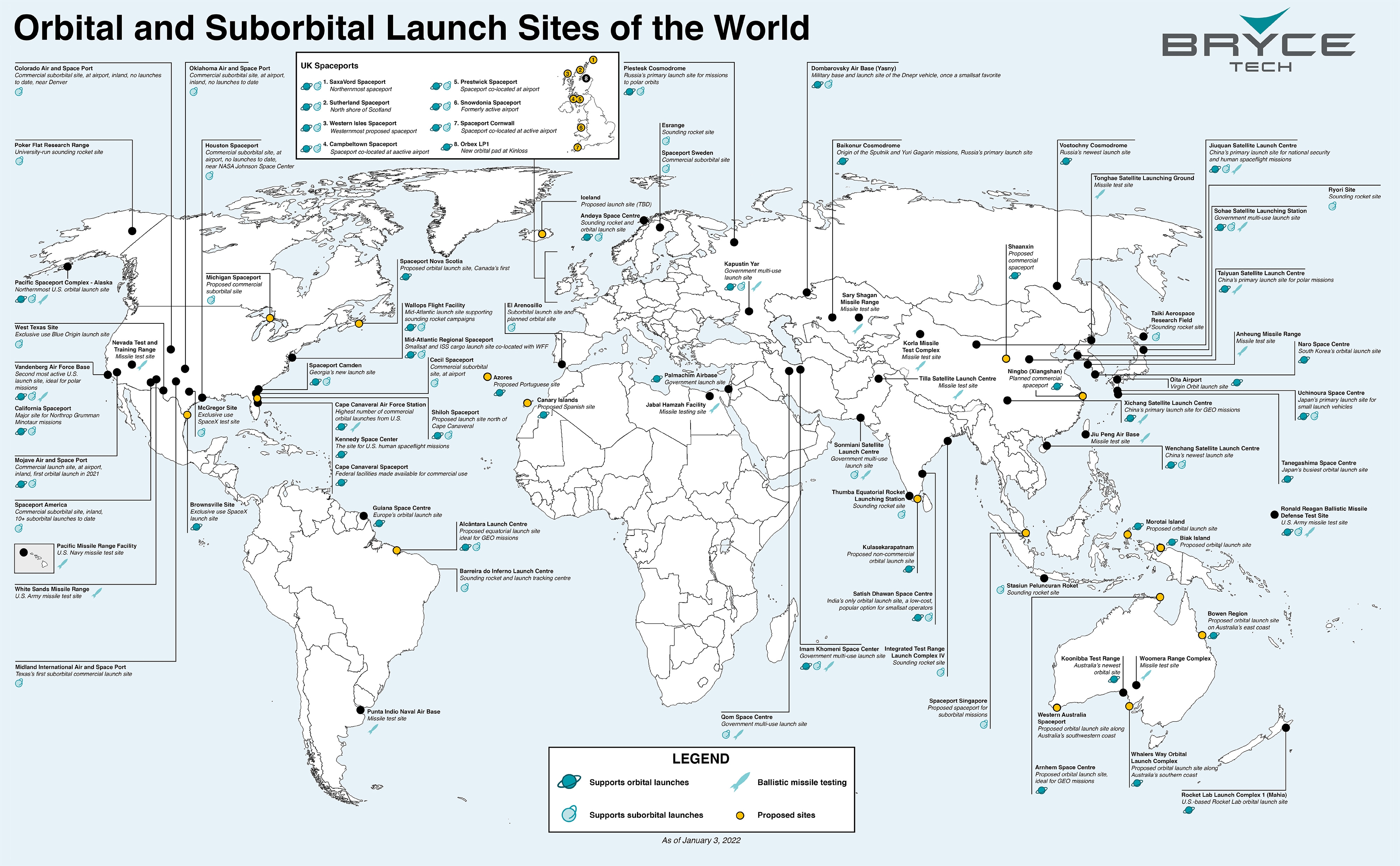 Dünyadaki yörünge ve yörünge altı fırlatma sahaları. Tam boyutlu görsel. Dünya genelindeki yörünge fırlatma sahalarının dağılımı incelendiğinde, tesislerin doğrudan ekvator üzerinde değil ancak ekvatora yakın düşük enlemlerde yoğunlaştığı görülüyor. Dediğimiz gibi bir fırlatma üssünün konumu, fırlatılacak roketin taşıma kapasitesini, yakıt tüketimini ve uydunun operasyonel ömrünü belirleyen temel değişkenler arasında bulunuyor. Somali, ekvatora olan yakınlığı ile bu engelleri aşmak için en ideal bir konumda bulunuyor.
