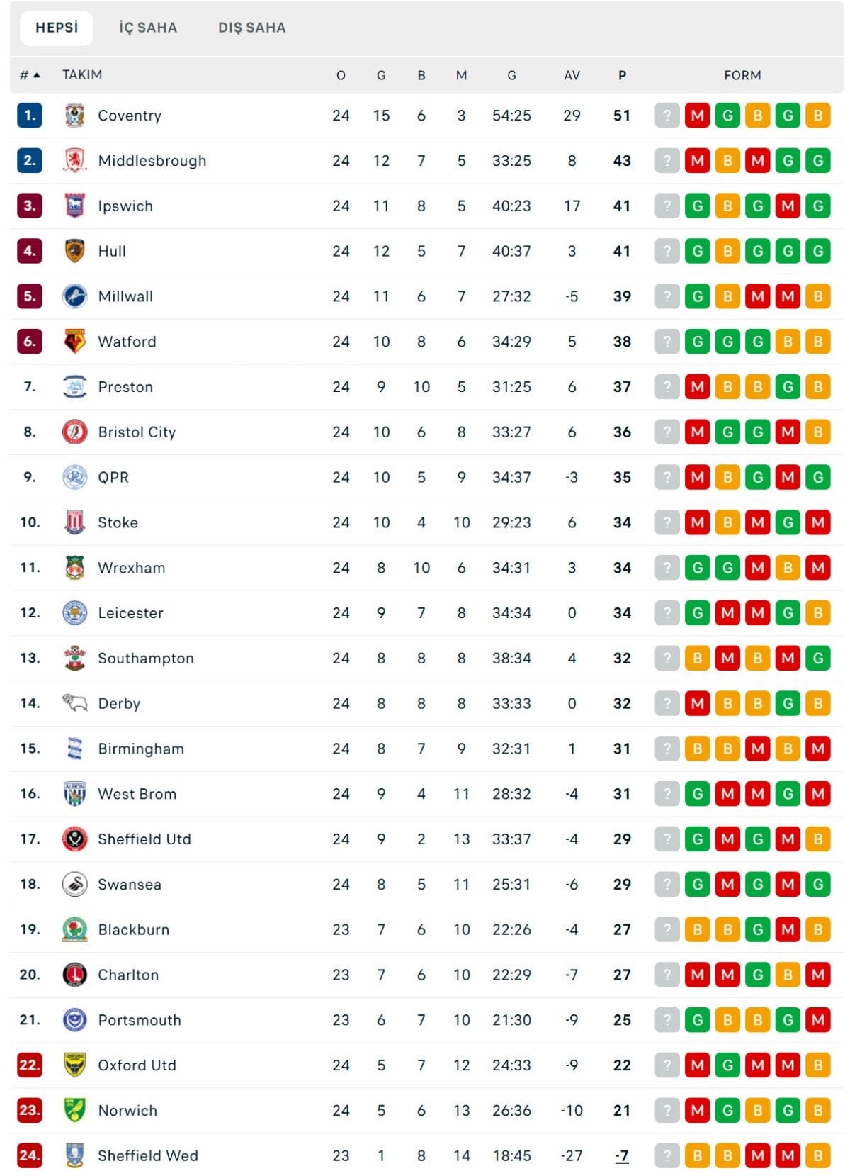 Son dönemde ligde düşüşe geçen ve galibiyet hasreti 3 maça yükselen Middlesbrough ise Hull City mağlubiyetinin ardından 43 puanda kaldı.